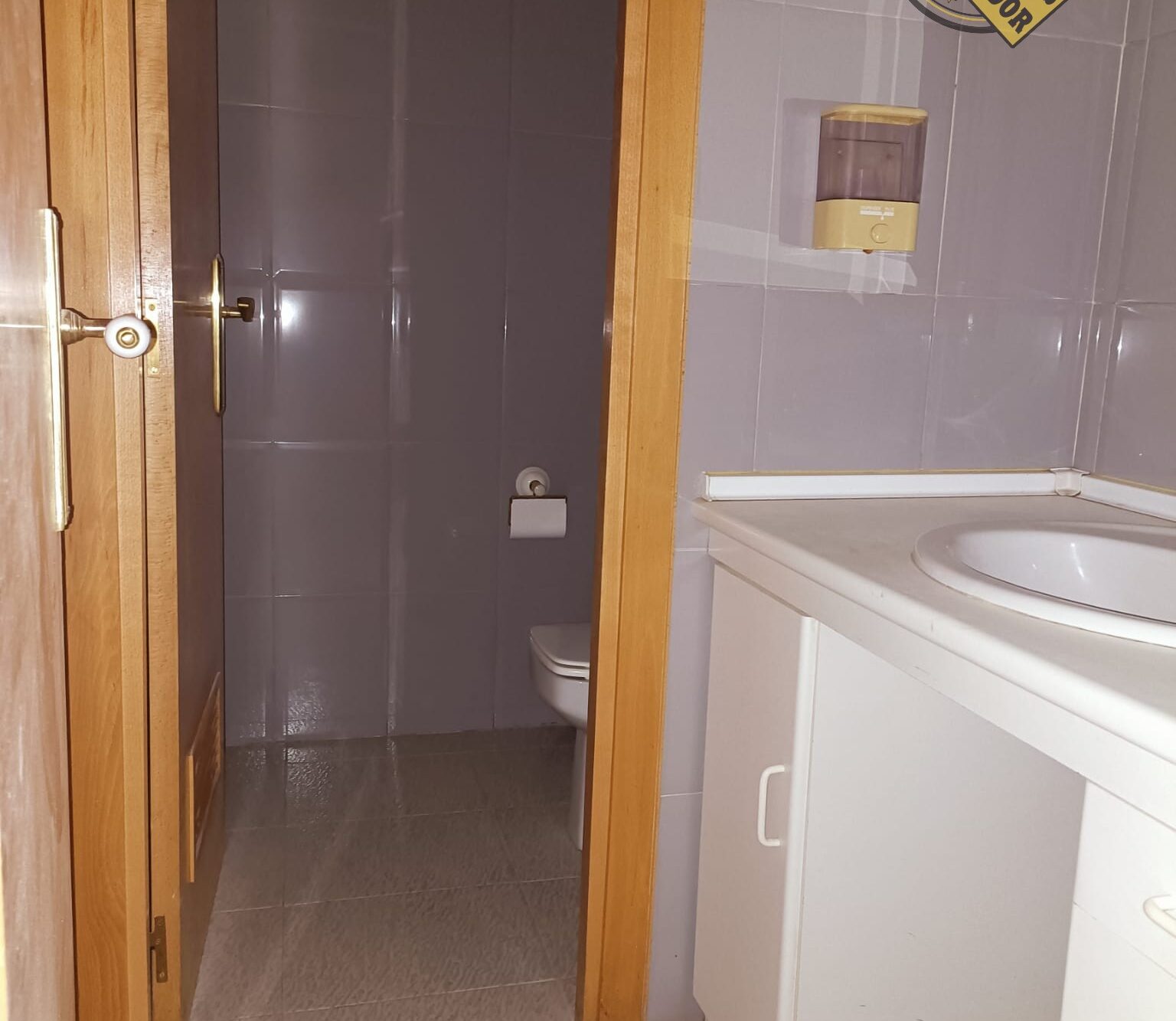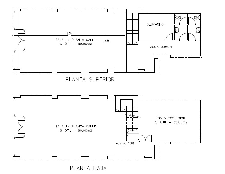 En la parte trasera dispone de una sala en planta baja de unos 40 m² y una planta primera de la misma superficie, donde se encuentran los aseos, un despacho y zonas comunes